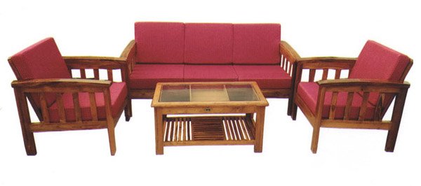 सोफा सेट १x २ सिटर व २ सिंगल सिटर कुशनसह सागवानी